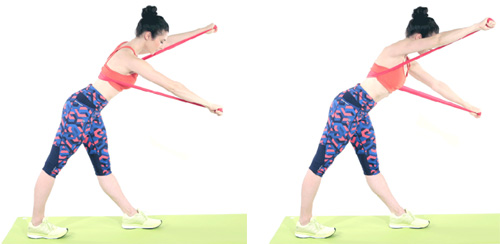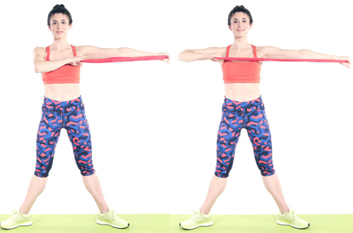 Đầu tiên giơ thẳng tay trái sang ngang, cầm chặt một đầu dây tập. Tay phải cầm đầu dây còn lại ở độ cao ngang ngực, kéo sang phía đối diện trong khi gập khuỷu tay lại.