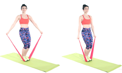 Vòng dây phía sau lưng, 2 tay cầm ở 2 đầu dây. Đứng ở tư thế chân trái bước lên trước, người hướng về trước một góc 45 độ. Trong khi phần thân dưới cố định thì bạn nâng lần lượt 2 tay lên xuống ở độ cao ngang tai.